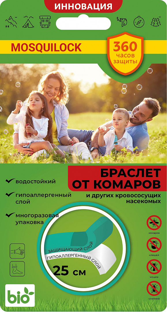 Средство с натуральным репеллентом защищает взрослых и детей от укусов комаров и других кровососущих насекомых. Браслет «Mosquitech» производится компанией «Терра Пласт» по собственной уникальной и запатентованной био-технологии - насыщения полимера (каждого из слоев) комплексом эфирных масел и экстрактов при низкой температуре. Данная технология позволяет сохранить 100% полезных свойств компонентов входящих в состав браслета, что позволяет достигать эффекта отпугивания и снижения количества укусов комаров и других кровососущих насекомых при их низкой и средней численности.