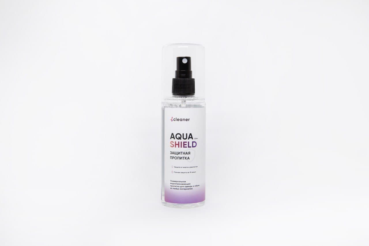 Защиткая пропитка AQUA-SHIELD 125ml от iCleaner для одежды и обуви из любых материалов. Универсальное покрытие для защиты обуви, одежды и аксессуаров из кожи, замши, нубука, текстиля и их сочетаний от влаги, грязи и реагентов.