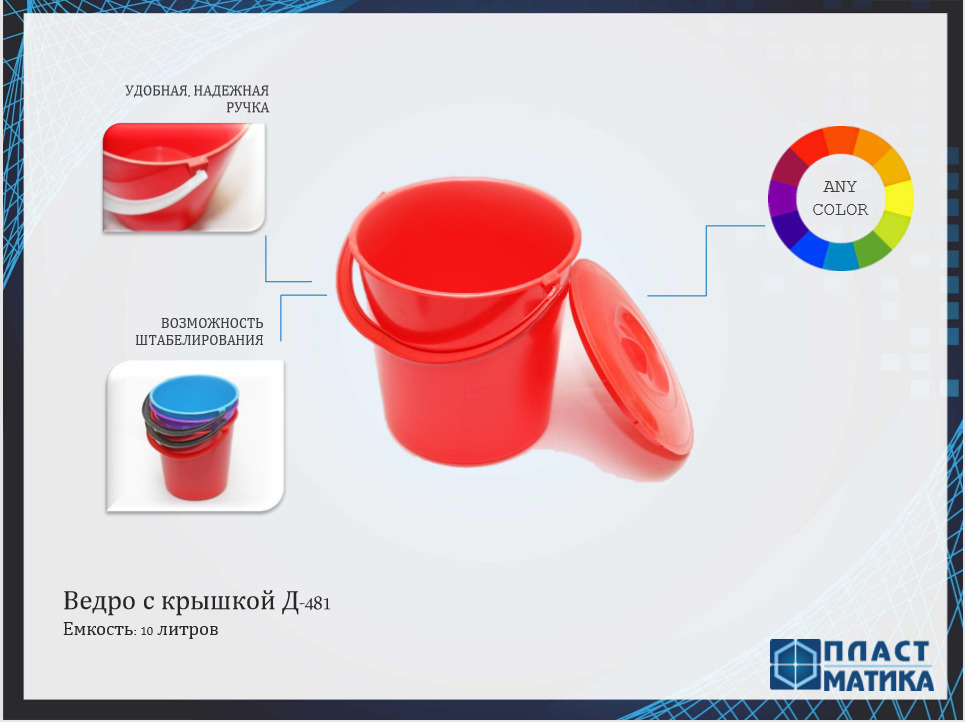 Ведро 10 л. Возможна продажа как с крышкой, так и без. Предназначено для хозяйственно-бытовых целей, изготовлено из высококачественного пластика. Имеет удобную надежную ручку. Штабелируется. Может быть изготовлено в любом цвете.