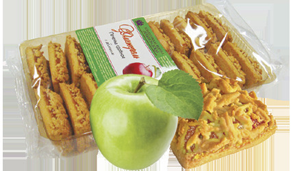 Сдобное печенье с фруктово-ягодными начинками фабрики «Ленинградская» изготавливается из высококачественного натурального сырья, без добавления консервантов и усилителей вкуса. Печенье обладает нежным вкусом и ароматом, в качестве начинки применяется: клубника, абрикос, яблоко, клюква, вишня.