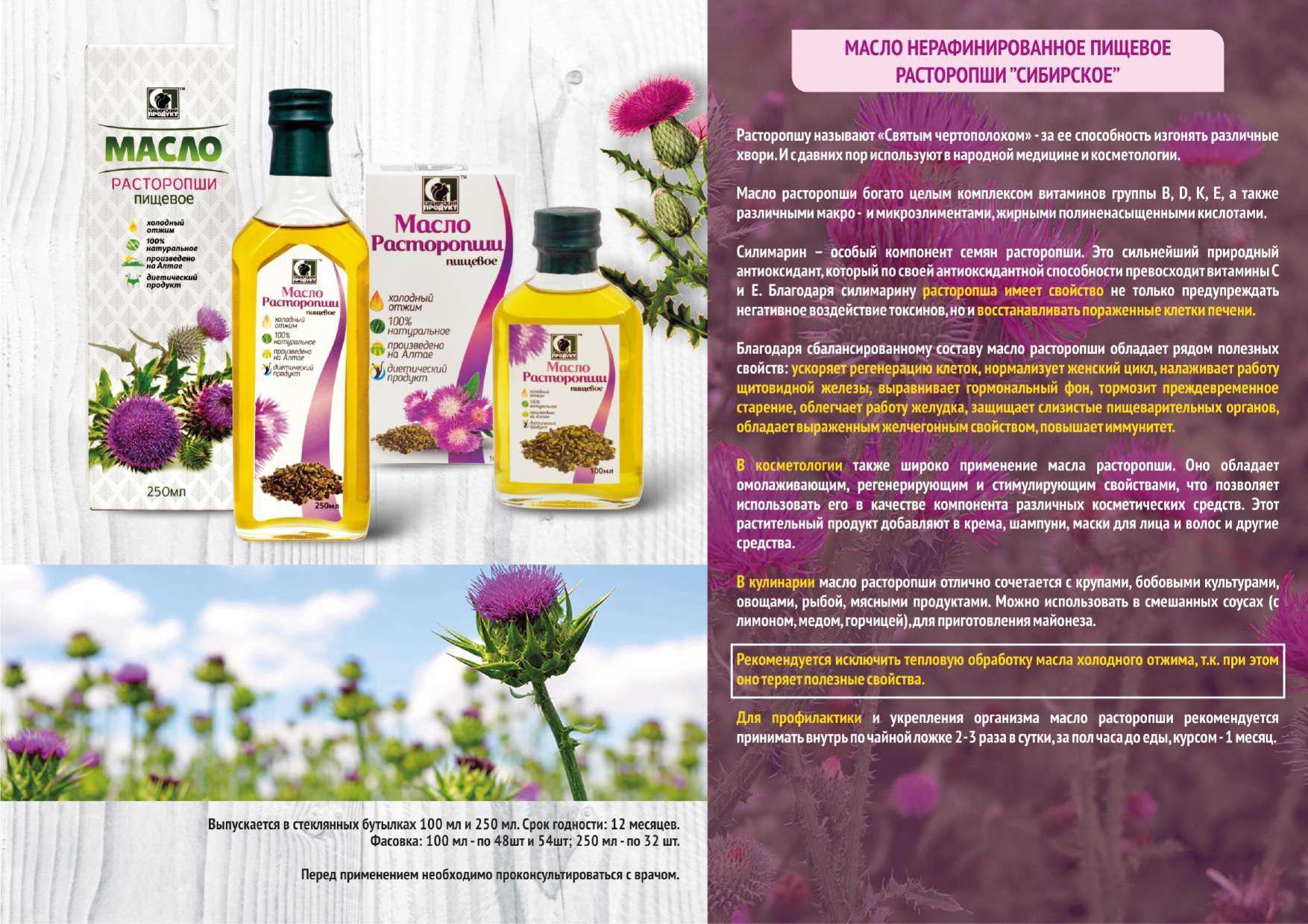 Масло нерафинированное пищевое расторопши "Сибирское" объемами 100 и 250 мл в стекле.