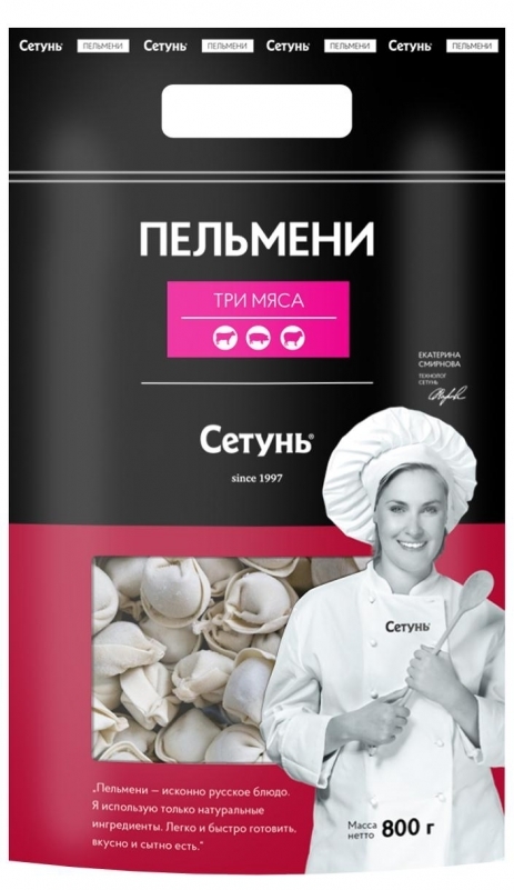 Пельмени замороженные фасованные - традиционное, любимое миллионами блюдо русской кухни. Фасуются в пакеты, масса нетто 0.8 кг, и гофрокоробы по 6 кг. Температура хранения -18 град. Цельсия. Мясоперерабатывающий завод «Сетунь» изготавливает пельмени:
