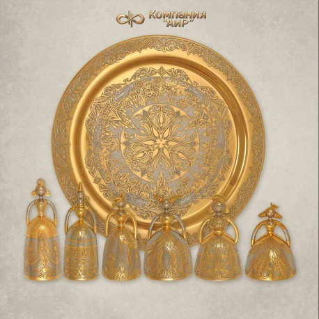 Компания «АиР» предлагает собственного производства наборы под алкоголь, винные, коньячные и водочные: рюмки, графин и поднос из полированного металла с гравировкой, покрытием золотом, с инкрустацией поделочными и ювелирными камнями.