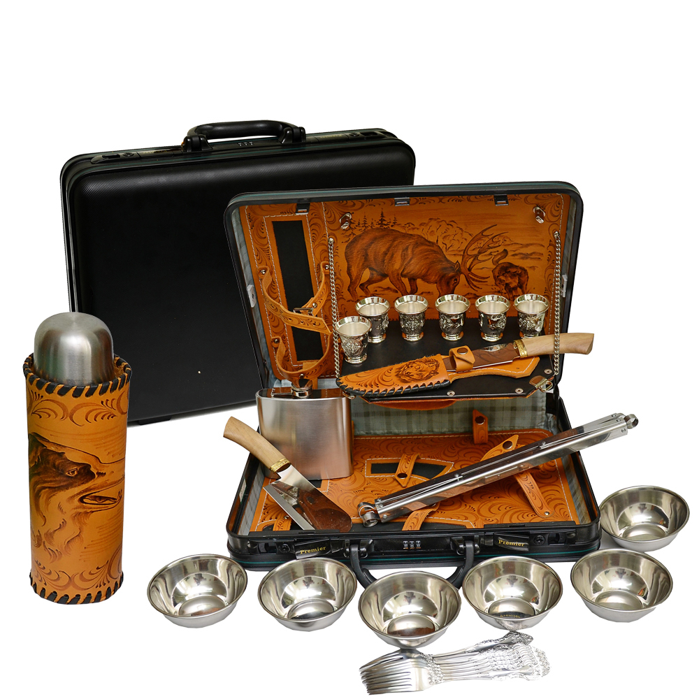Подарочные наборы в кейсах - великолепный подарок с необходимыми для похода на природу предметами. Предлагаются в дипломатах с отделкой кожей и рисунками или одноцветных. Производственная компания «Пикник-Сервис» выпускает десятки моделей.