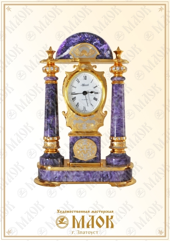 Художественная мастерская МАОК делает сувенирные часы настольного исполнения из поделочных камней: чароита и яшмы.