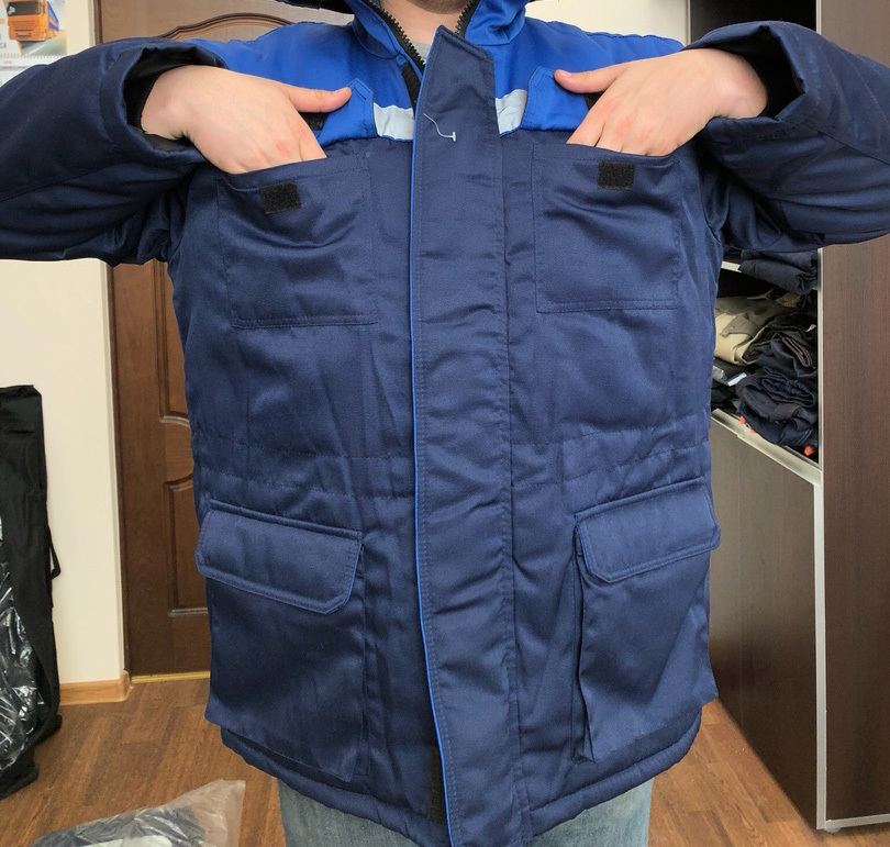 Костюм синего цвета изготовлен из прочной смесовой ткани плотностью 210 грамм. Содержание хлопка дает возможность ткани дышать. Ткань дополнительно обработана водоотталкивающей пропиткой. В качестве утеплителя используется многослойный синтепон. Эти материалы обеспечат надежную защиту от холода и ветра, к тому же смесовая ткань благодаря пропитке имеет свойство отталкивать воду, а не впитывать.