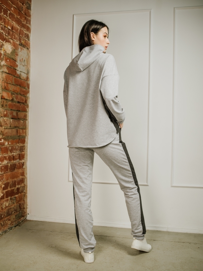 Трикотажный костюм из качественного футера для сезона осень-весна. Брюки свободного кроя со средней посадкой прекрасно сидят на любой фигуре, по бокам вставки противоположного цвета , внизу манжет, кулиска по талии, имеют два кармана. Отлично сидят, хорошо растягиваются, незаменимы для любителей утренних пробежек, прогулок на велосипеде, занятий спортом в зале людей ведущих активный образ жизни! Футер не мнется, не деформируется, не вытягивается, благодаря уникальному производству - переплетению 2-х нитей. У изделия высокая износостойкость: с лицевой стороны ткань гладкая, на ней не образуются катышки, зацепки, стрелы.