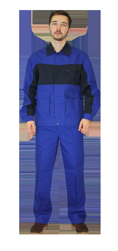 Мужской рабочий костюм состоит из куртки на притачном поясе, с двумя накладными карманами с клапанами и одним нагрудным карманом на молнии.