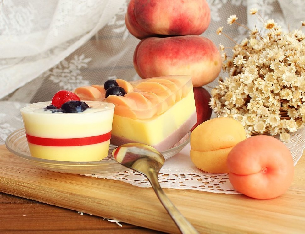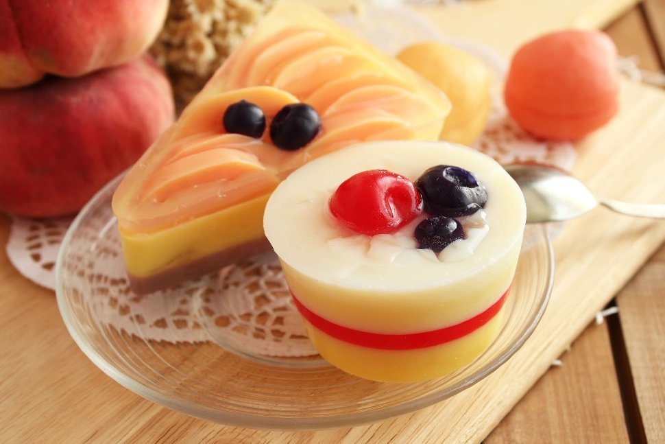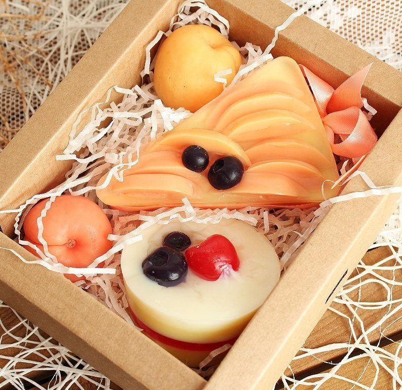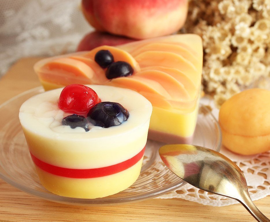 2. Ягодное пирожное с ванилью, молоком и клубничным желе. Мыло для рук с увлажняющим эффектом.