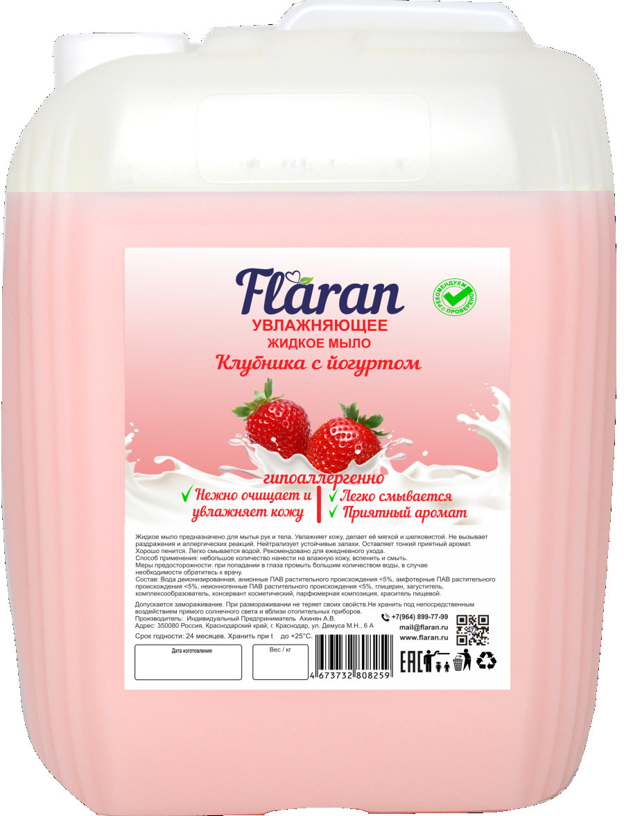 Жидкое мыло Flaran подходит для бережного мытья рук и тела. Особая формула жидкого мыла содержит несколько увлажняющих компонентов, в том числе глицерин, которые способствуют деликатному уходу за кожей, не сушит и не вызывает раздражения после использования, обладает хорошим очищающим эффектом с первого применения. Нейтрализует устойчивые запахи. Мыло гипоаллергенно и экологически безопасно. Подходит для всех типов кожи. Нежная текстура легко пенится и смывается, оставляя на коже приятный аромат, который держится продолжительное время. Подходит для ежедневного использования. Безопасен для детей. Экономичный расход за счет счет густой консистенции. Жидкое мыло Flaran подойдет для любого диспенсера.