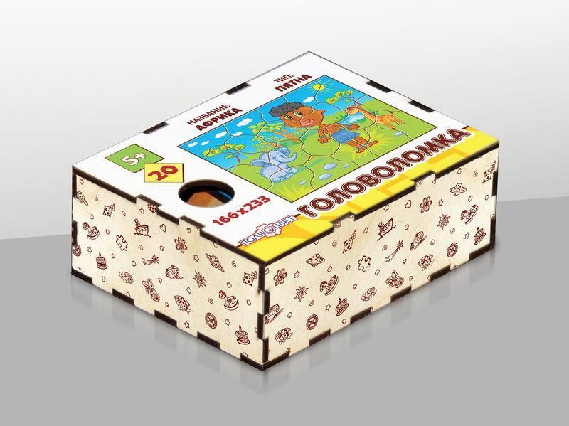 Фрагменты пазла хранятся в компактной деревянной коробке,расписанной симпатичными детскими рисунками. В нее ребенок охотнее убирает детали после игры.