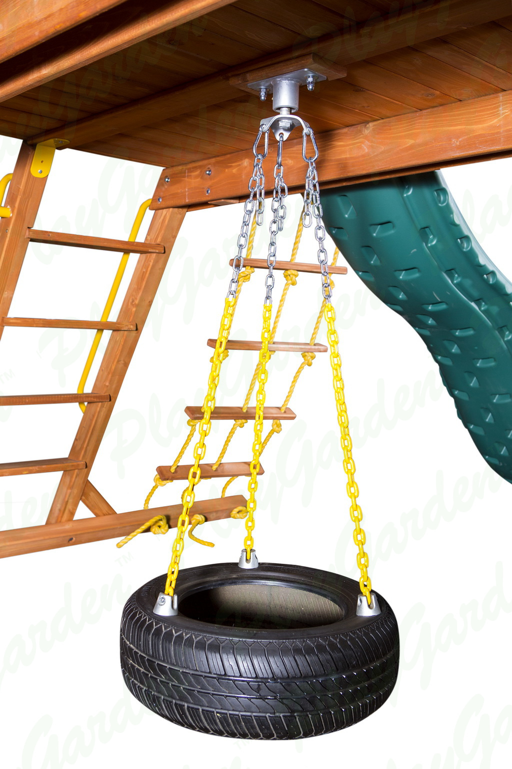 Оснащен пластиковыми игровыми элементами, горкой с двойной волной, рукоходом, качельной балкой с качелями, скалодромом и веревочной лестницей.