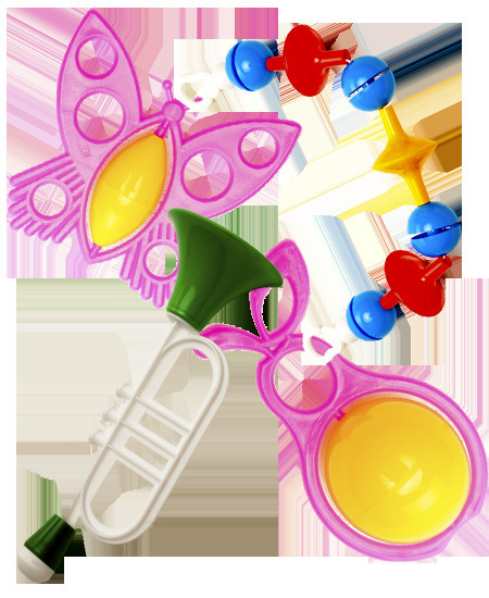 Погремушки - Ракетка, Букет, Светофор, Вертушка, Шарик, Яблоко, Груша, Бабочка, Лягушонок, Ромашка, Цветок, Забияка, Волчок, Юла, Калейдоскоп, Ягодное лукошко, Кошечка, Страусенок, Совенок, Попугайчик.