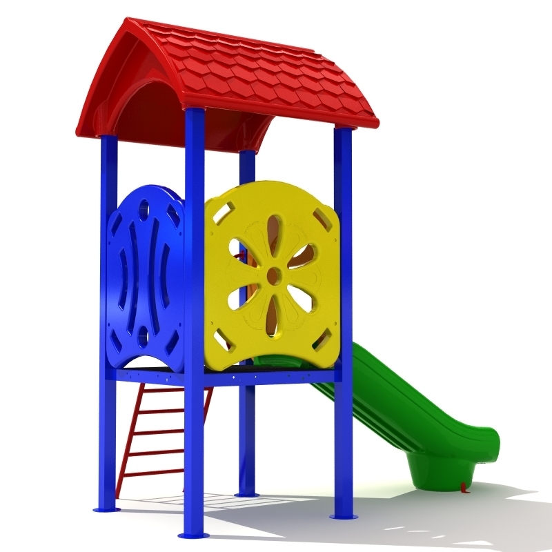 Комплекс состоит из горки, лесенки, перил, домика. Возможны различные цветовые варианты, различные варианты крыш.
