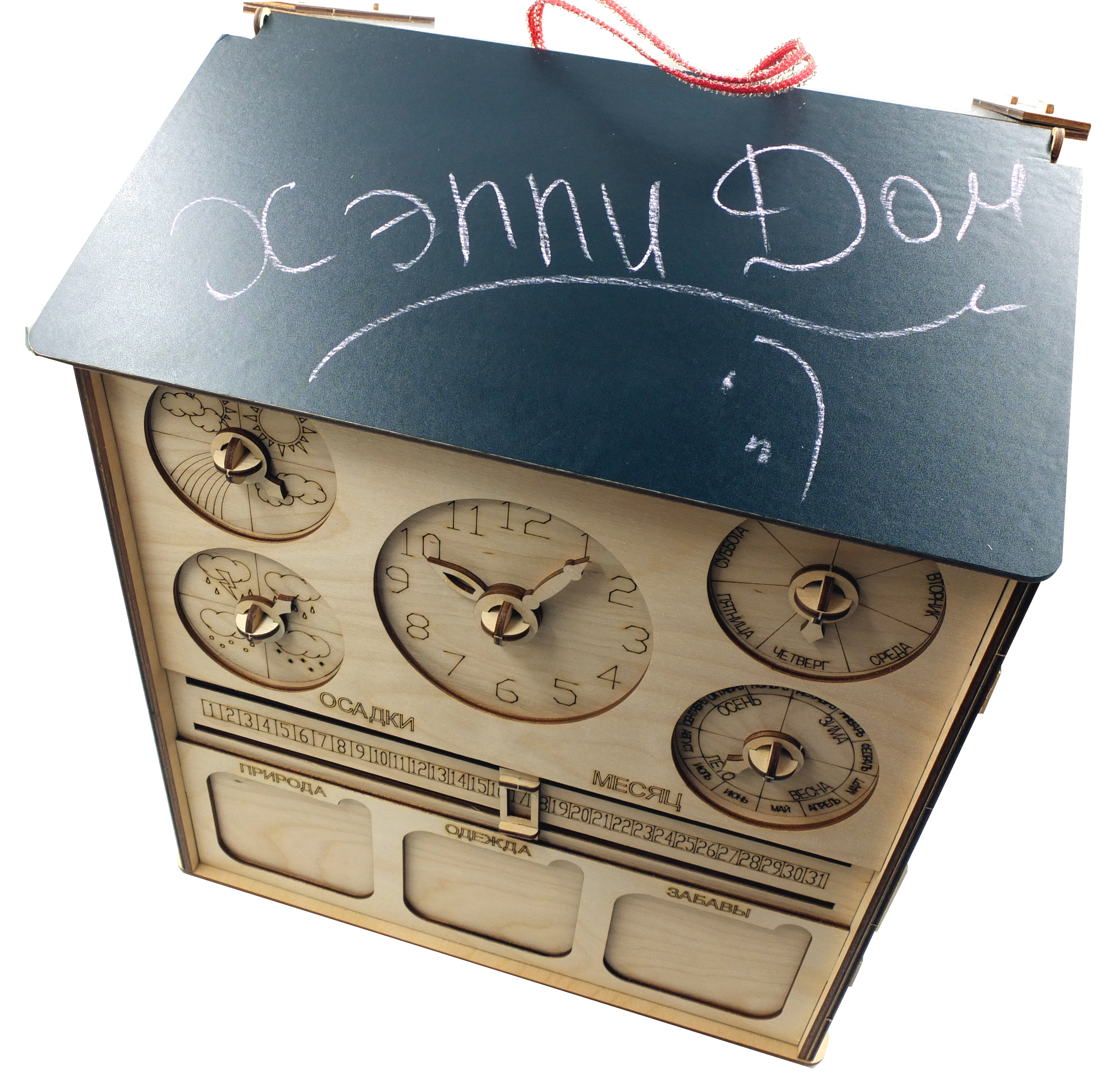 БизиДом собирается как конструктор из фанеры, но без клея. Меловая доска уже наклеена на крышу и все шнурочки в комплекте.