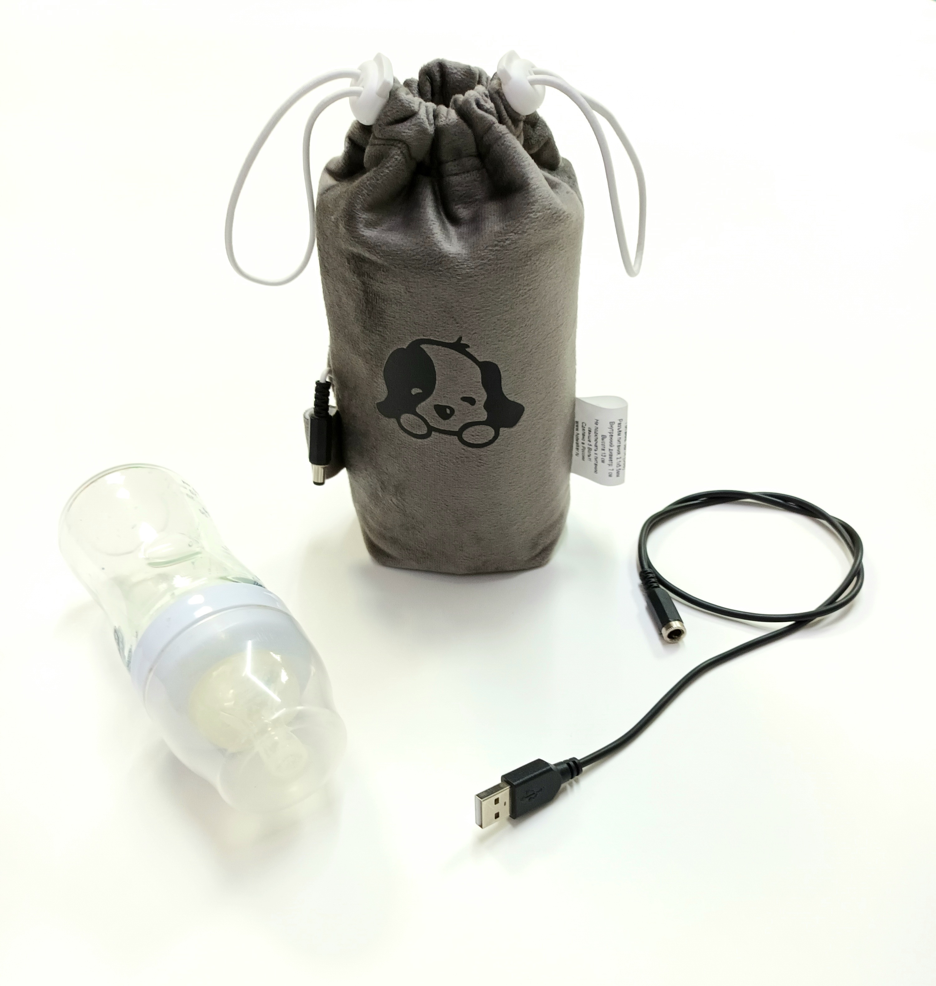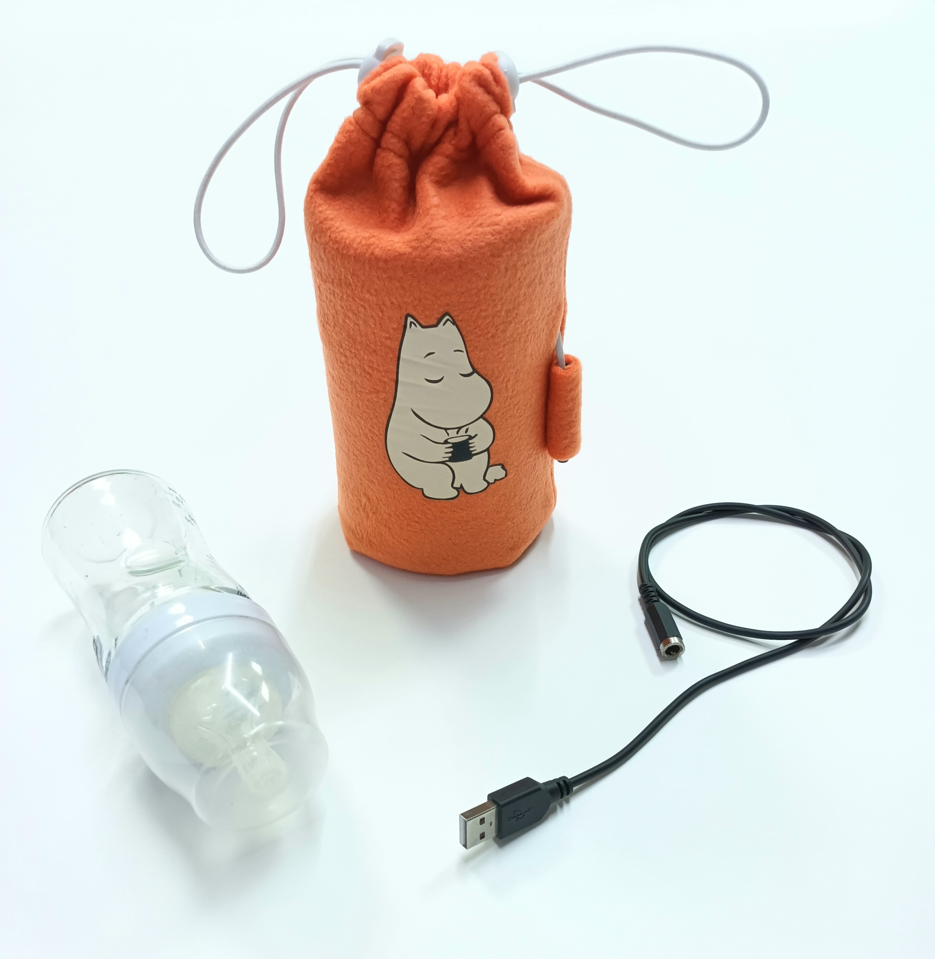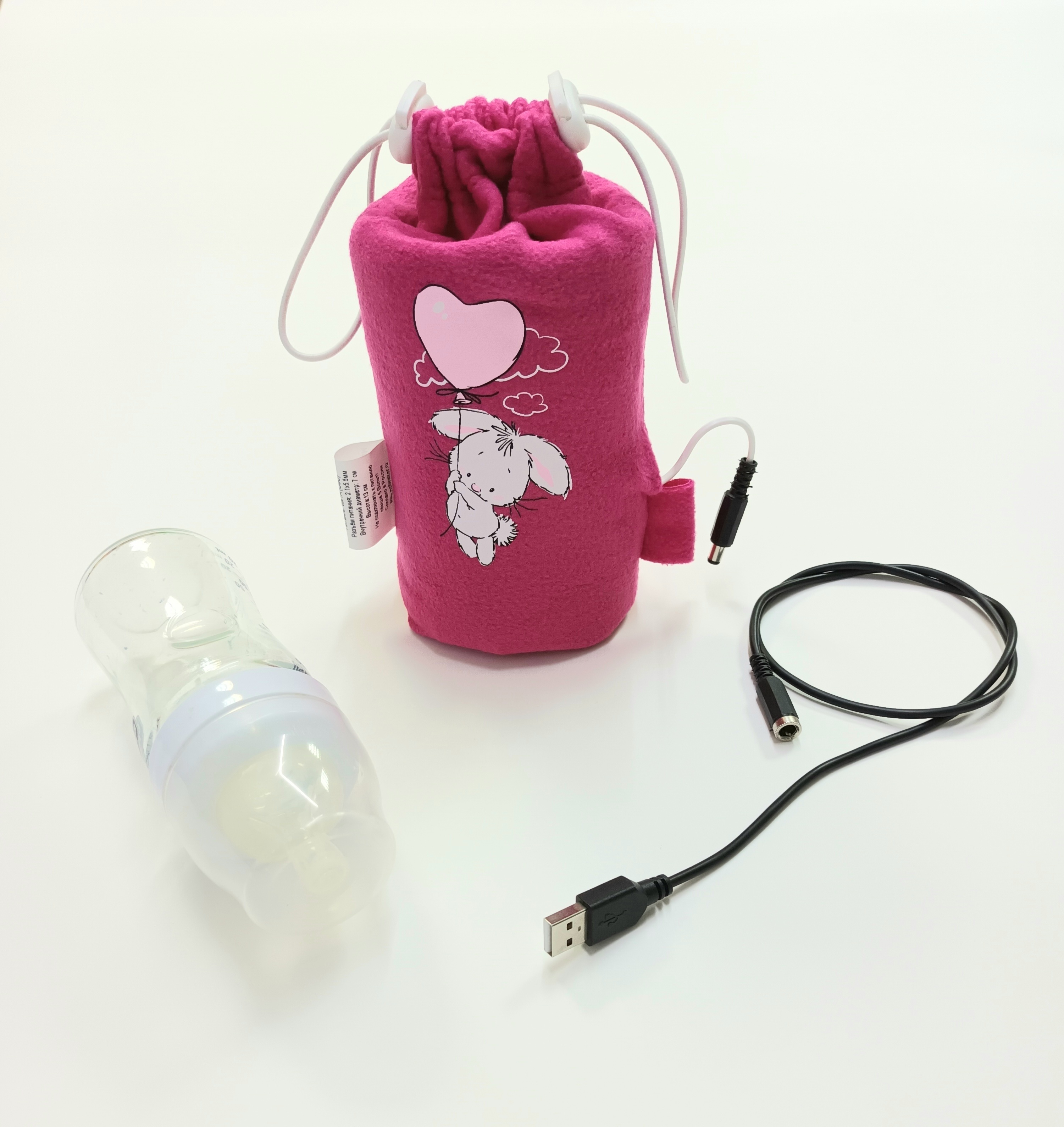 Сумка представляет из себя цилиндрический каркас диаметром 7см и высотой 14 см помещенный в съёмный чехол из флиса. Отросток провода выходящий наружу подключается к удлинителю и может питаться от любого источника 5 Вольт USB