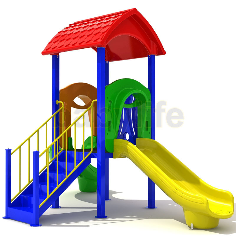 Комплекс состоит из горки, лесенки, перил, домика. Возможны различные цветовые варианты, различные варианты крыш.