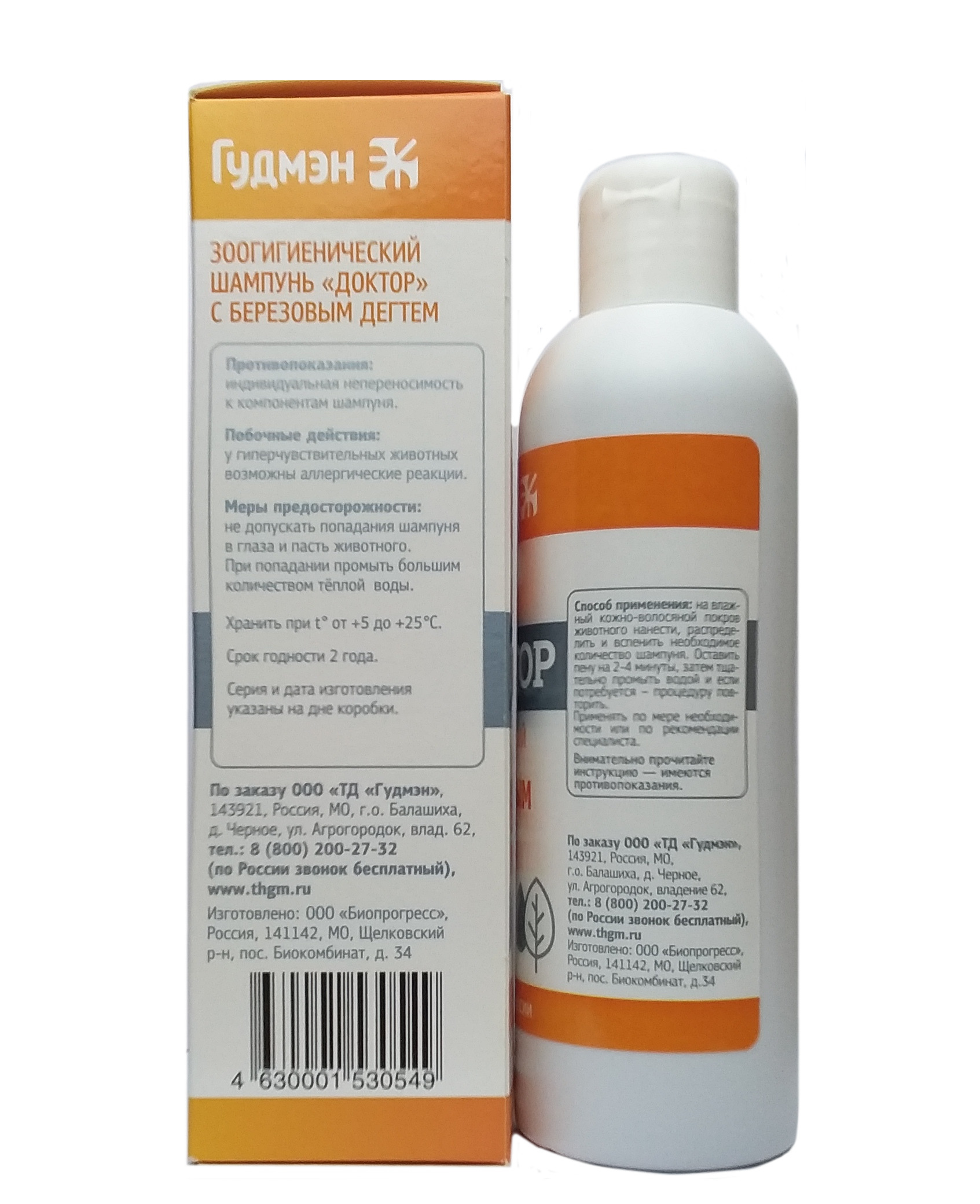 Шампунь предназначен для регулярного ухода за животными с проблемной кожей и шерстью. Деготь в составе шампуня обладает анисептическим, антибактериальным, противогрибковым и регенерирующим свойствами.