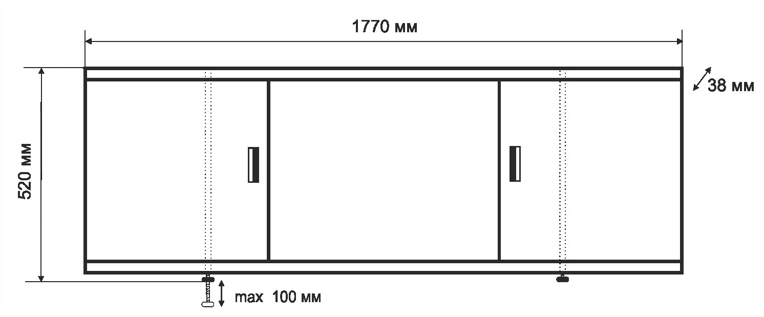 Каркас экрана выполнен из алюминиевого профиля, двери изготовлены из МДФ и покрыты ПВХ пленкой толщиной 0,45 мм. Экран имеет 3 раздвижных створки. Алюминиевый профиль окрашен порошковой краской белого цвета. Высота экрана 500 мм+ножки 20 мм. Ножки регулируются на 100 мм. Вертикальные стойки смещены к центру, что позволяет при необходимости его подрезать.
