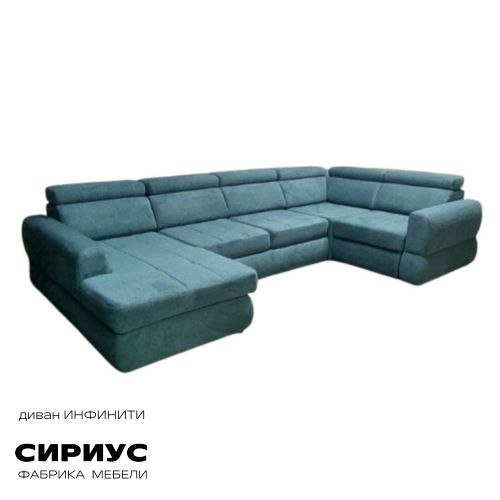 Российская фабрика-поставщик мягкой мебели из Челябинска "СИРИУС" предлагает оптовым заказчикам купить по выгодной цене модульный диван «Инфинити». Характеристики модели: размеры: 3500 х1750 х1050 мм.; высота сидения 460 мм., каркас: брус хвойных пород, березовая фанера и ДСП; материал обивки: ткань, искусственная кожа; наполнитель: листовой ППУ, синтепон, геовойлок; механизм трансформации: «Дельфин». Цвета на выбор. Преимущества модели: «Инфинити» — универсальный диван повышенной комфортности, функциональный с несколькими возможностями конфигурации; обивка дивана на выбор заказчика; за счет крепкого каркаса из древесины хвойных пород влажностью 8-10%, диван не подвержен деформированию; короба для хранения белья с ламинированным основанием. Также производитель предлагает в каталоге продукции ассортимент прямых диванов и угловых (см. на сайте фабрики)