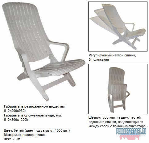 Шезлонг пластиковый складной, с регулируемым наклоном спинки, 3 положения. 610х900х930h, в слож. виде 610х300х1200h