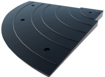Элемент комплекта приподнятого пешеходного перехода. Устанавливается по углам уложенной из средних элементов площадки перехода и элементами «заезд». Имеет форму скошенного четверть-круглого сектора 450х450х5-58 мм с уменьшением высоты грани в сторону заезда/съезда автомобиля. Изготовлен из полимерно-песчаной смеси, окрашенной в черный цвет.