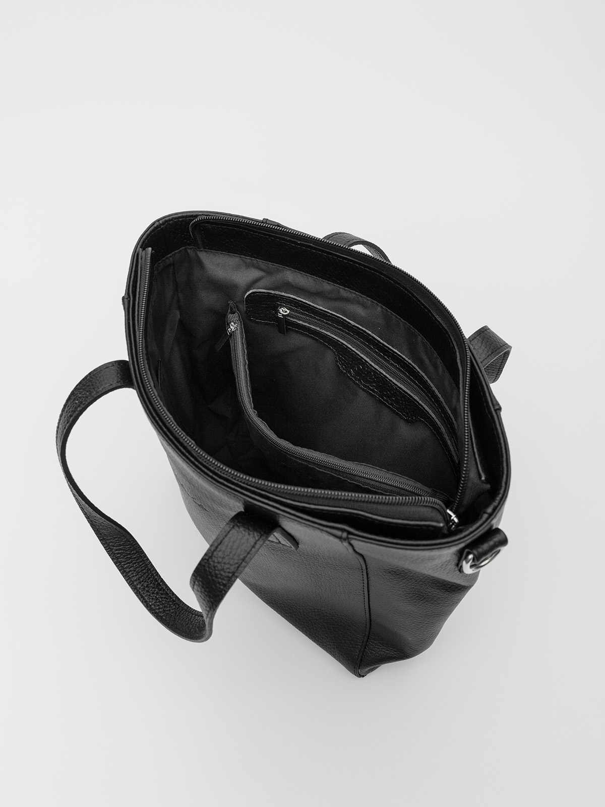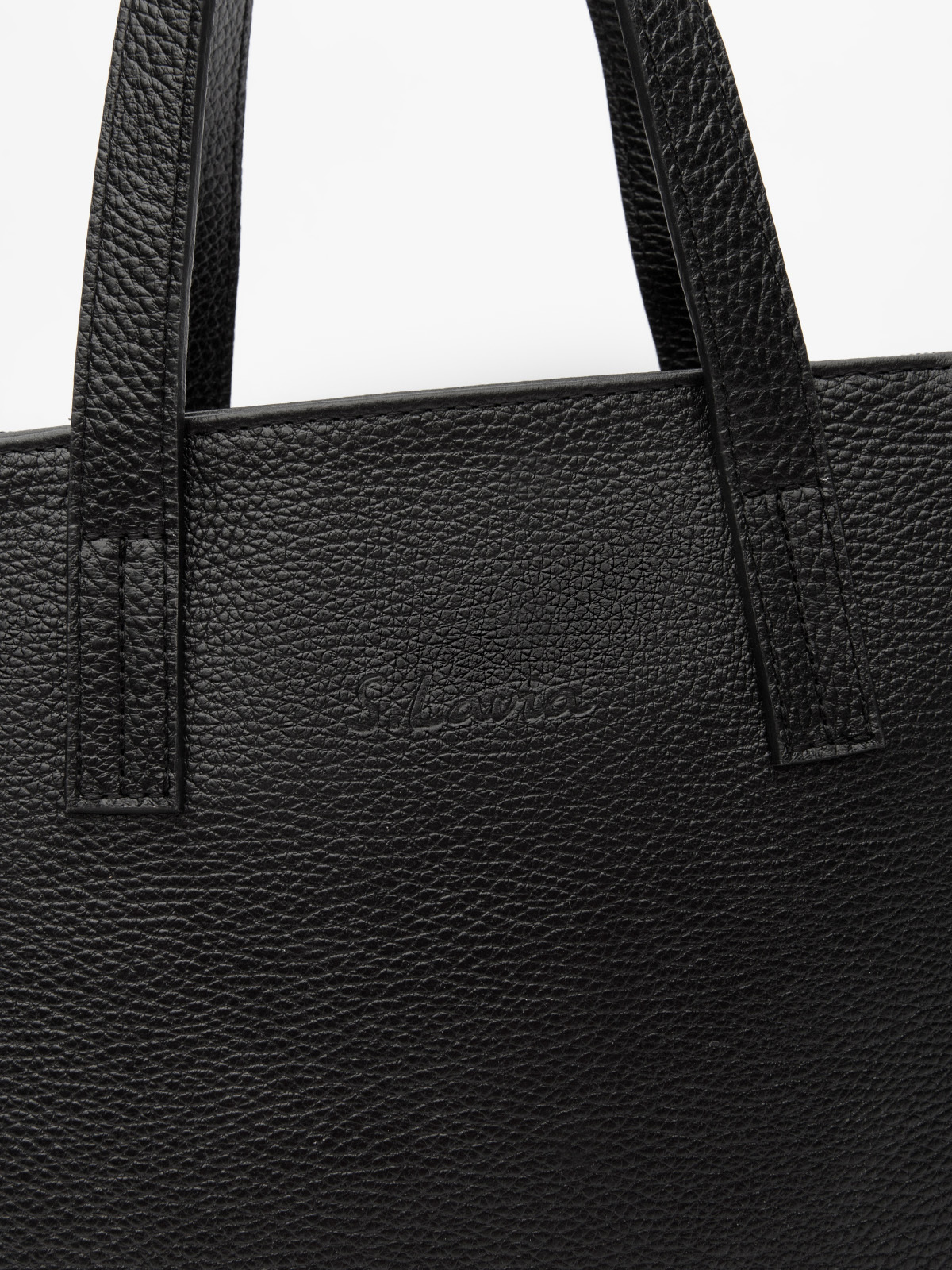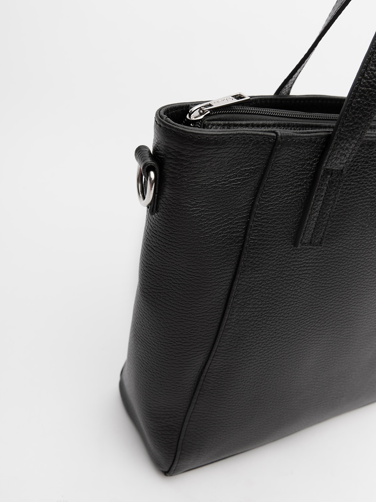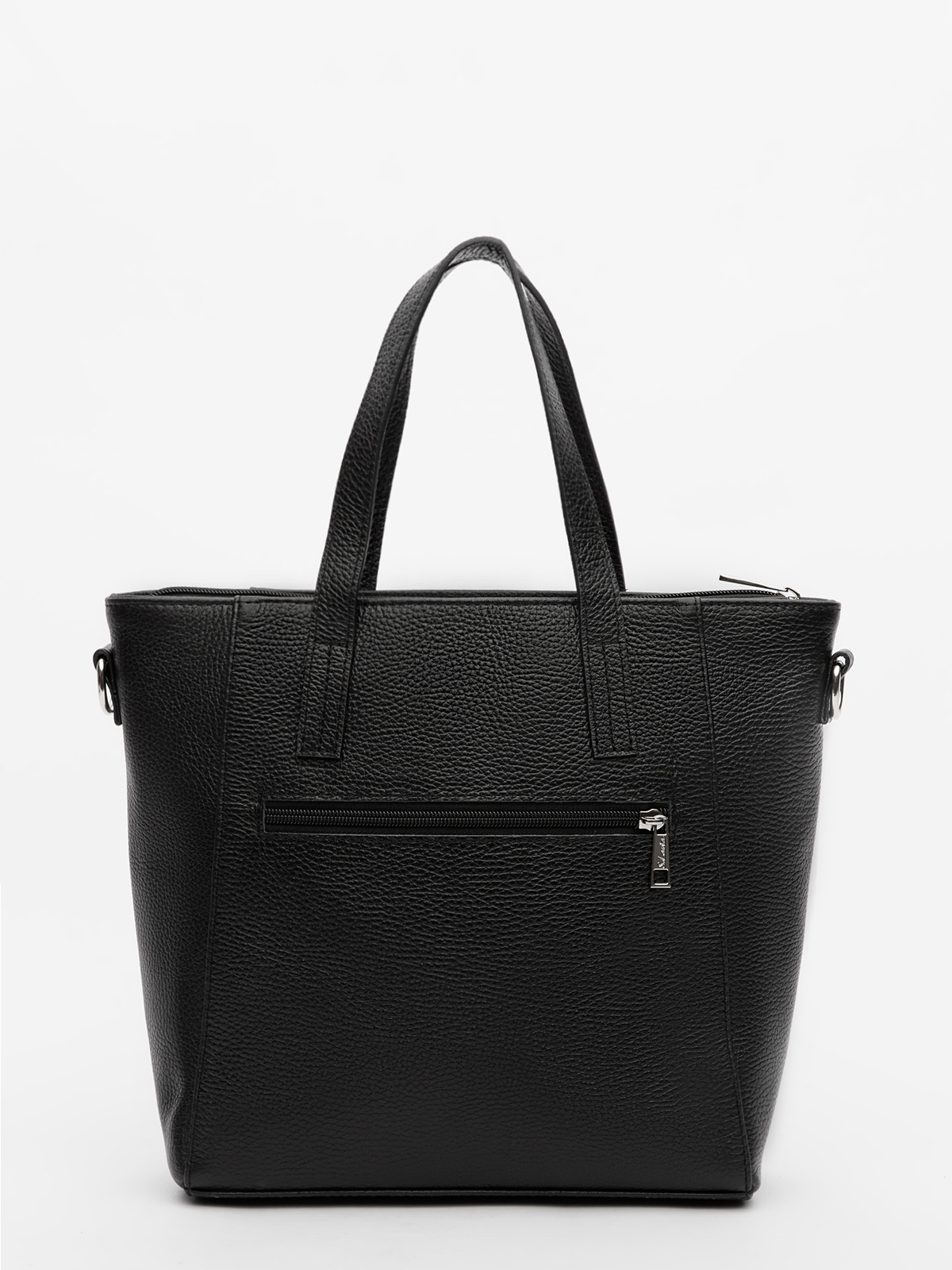 Элегантный кожаный тоут среднего размера с трапециевидным силуэтом, сужающимся книзу. Длинные настрочные ручки и съемный регулируемый ремень на карабинах предлагают несколько вариантов ношения. Внутри - три стандартных кармана для удобного хранения мелочей. Задний карман на молнии обеспечивает быстрый доступ к необходимым вещам. Стильное тиснение на передней части завершает лаконичный классический дизайн сумки.
