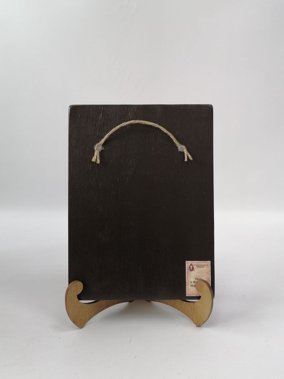 Икона на дереве покрыта несколькими слоями экологически чистого лака, который не выделяет вредных веществ и обеспечивает высокую устойчивость к выцветанию, воздействию ультрафиолета и влаги. Тыльная поверхность доски покрыта темной краской и 3 слоями защитного лака, что предотвращает выгибание иконы.