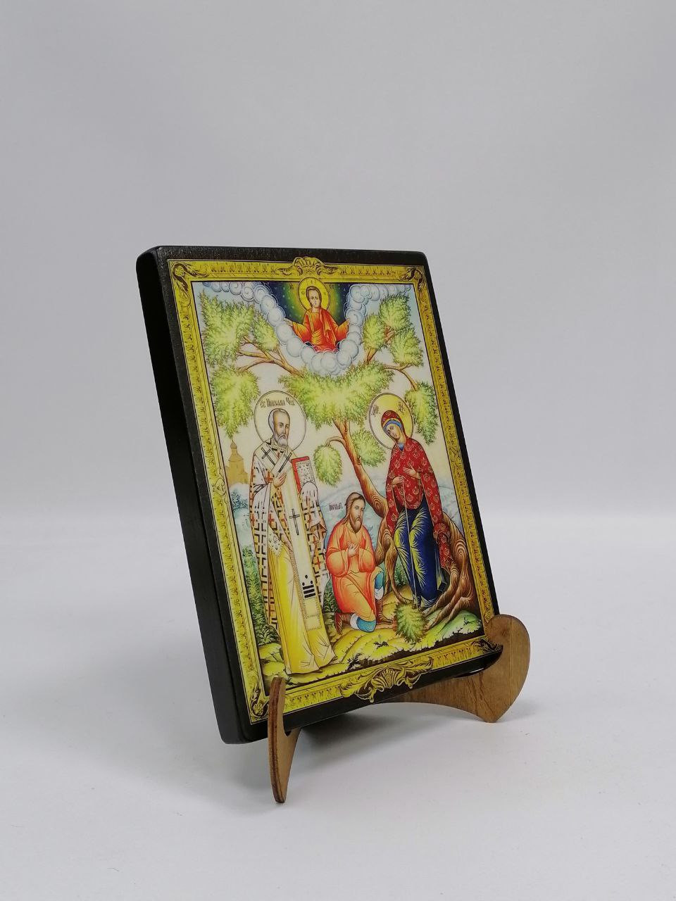 Икона на дереве покрыта несколькими слоями экологически чистого лака, который не выделяет вредных веществ и обеспечивает высокую устойчивость к выцветанию, воздействию ультрафиолета и влаги. Тыльная поверхность доски покрыта темной краской и 3 слоями защитного лака, что предотвращает выгибание иконы.