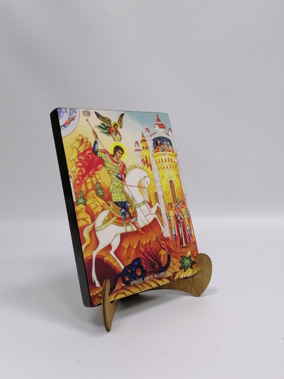 Икона на дереве покрыта несколькими слоями экологически чистого лака, который не выделяет вредных веществ и обеспечивает высокую устойчивость к выцветанию, воздействию ультрафиолета и влаги. Тыльная поверхность доски покрыта темной краской и 3 слоями защитного лака, что предотвращает выгибание иконы.