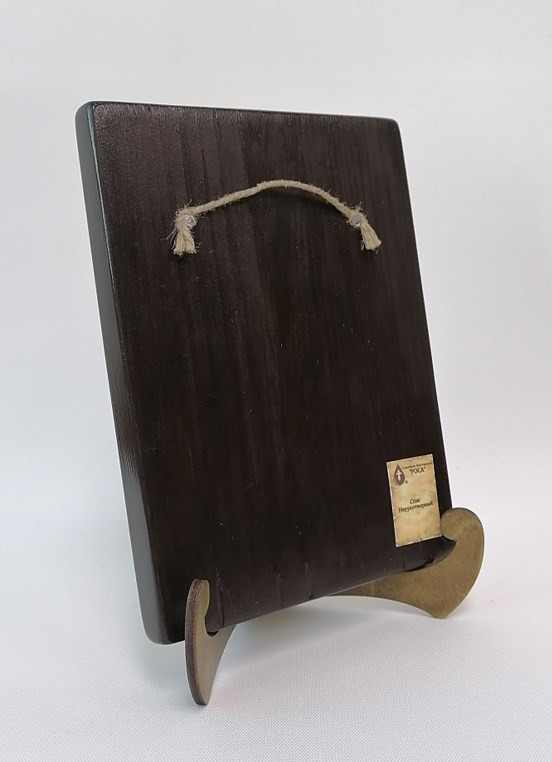 Икона на дереве покрыта несколькими слоями экологически чистого лака, который не выделяет вредных веществ и обеспечивает высокую устойчивость к выцветанию, воздействию ультрафиолета и влаги. Тыльная поверхность доски покрыта темной краской и 3 слоями защитного лака, что предотвращает выгибание иконы.