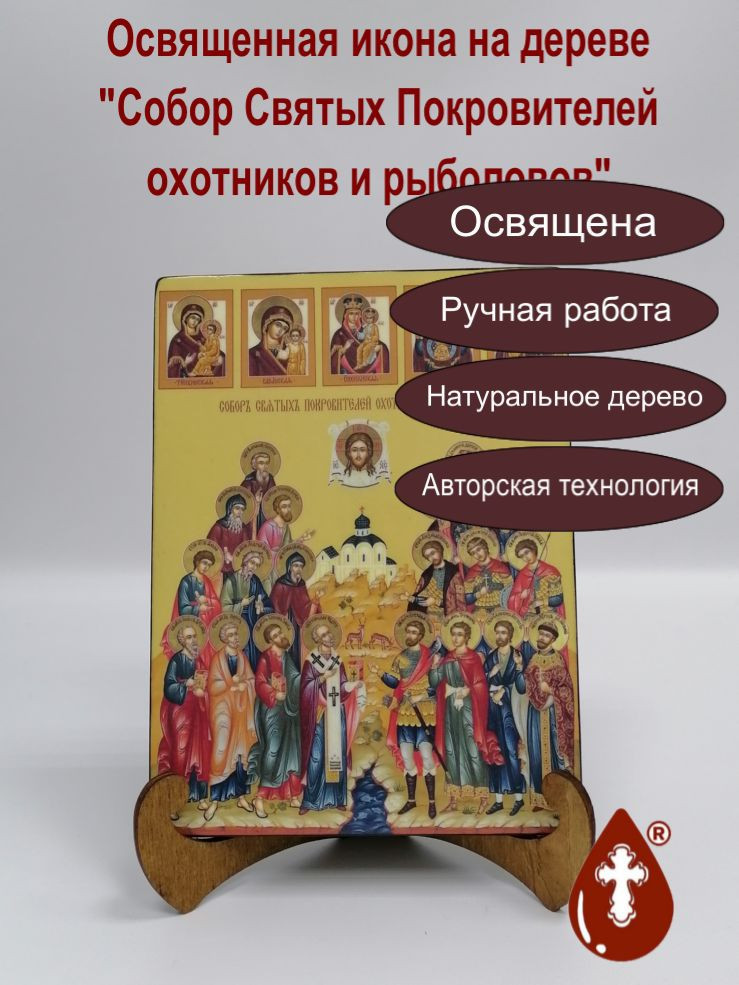 Икона на дереве "Собор святых покровителей охотников и рыболовов, 15x20x1,8 см, арт Ид4913" станет прекрасным подарком для верующего человека, а также займет особое место в любом доме, храме или церкви.