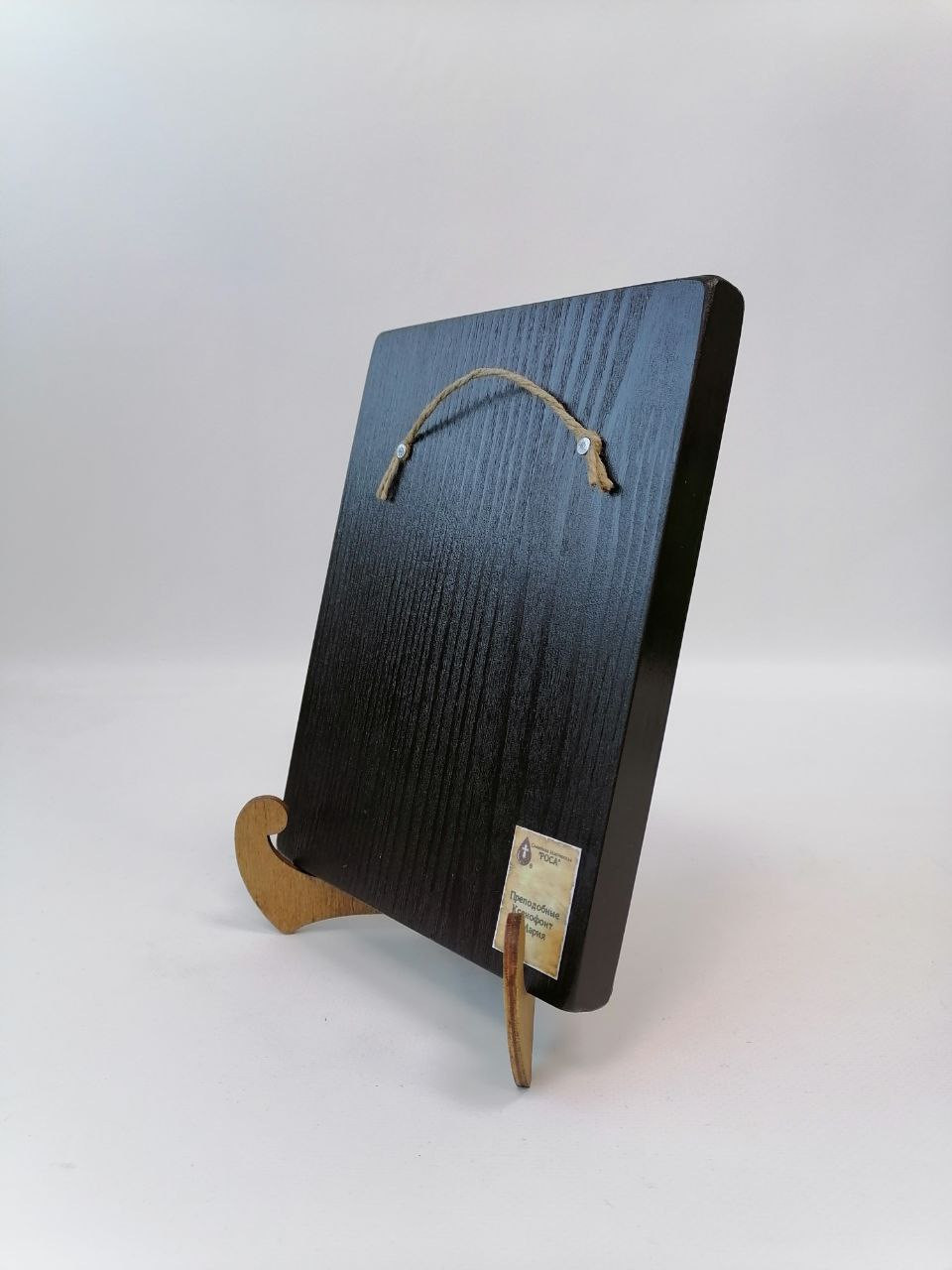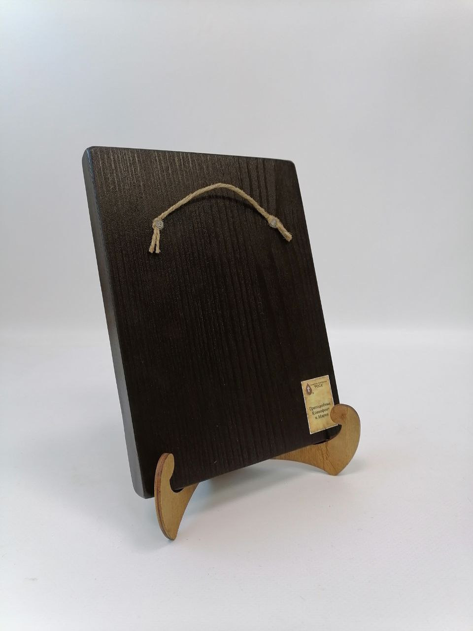 Икона на дереве покрыта несколькими слоями экологически чистого лака, который не выделяет вредных веществ и обеспечивает высокую устойчивость к выцветанию, воздействию ультрафиолета и влаги. Тыльная поверхность доски покрыта темной краской и 3 слоями защитного лака, что предотвращает выгибание иконы.