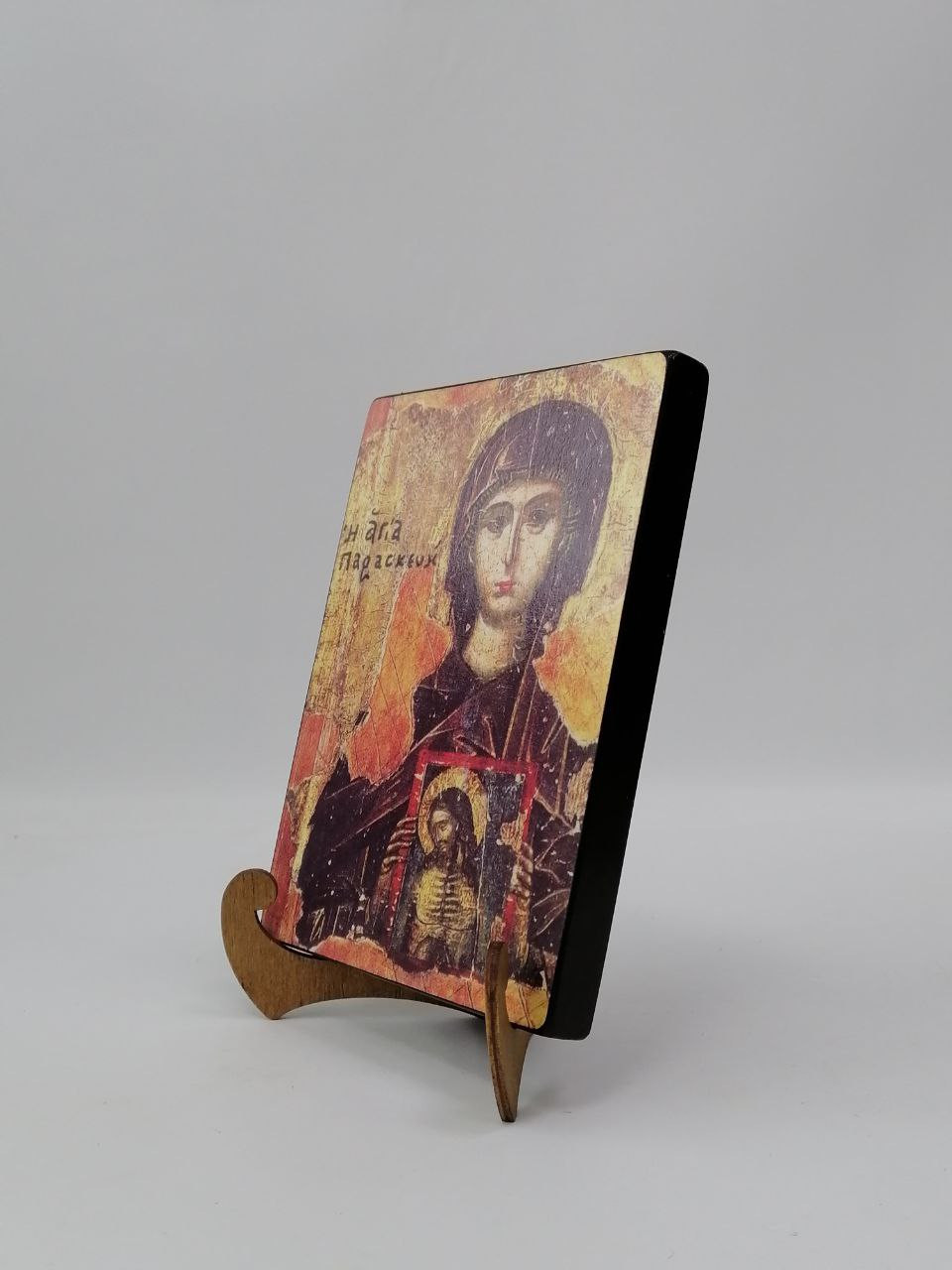 Икона на дереве покрыта несколькими слоями экологически чистого лака, который не выделяет вредных веществ и обеспечивает высокую устойчивость к выцветанию, воздействию ультрафиолета и влаги. Тыльная поверхность доски покрыта темной краской и 3 слоями защитного лака, что предотвращает выгибание иконы.