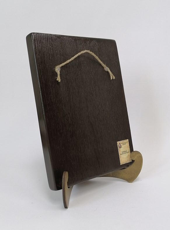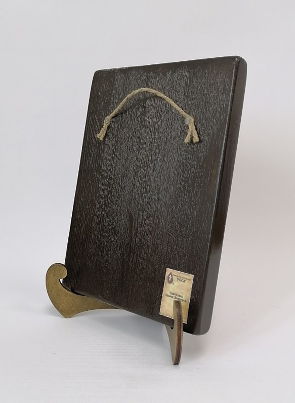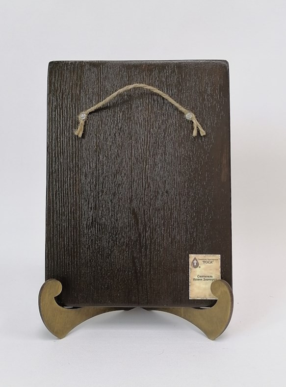 Икона на дереве покрыта несколькими слоями экологически чистого лака, который не выделяет вредных веществ и обеспечивает высокую устойчивость к выцветанию, воздействию ультрафиолета и влаги. Тыльная поверхность доски покрыта темной краской и 3 слоями защитного лака, что предотвращает выгибание иконы.