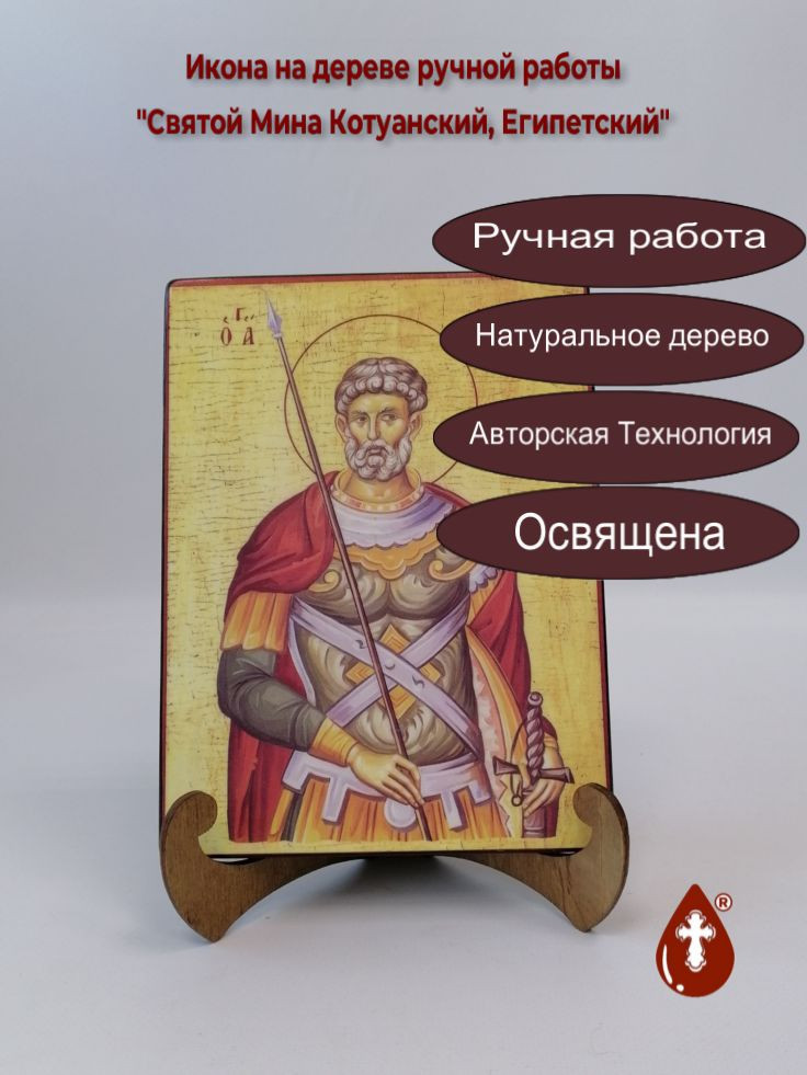 Икона на дереве "Святой Мина Котуанский, Египетский, 15x20x1,8 см, арт А6719" станет прекрасным подарком для верующего человека, а также займет особое место в любом доме, храме или церкви.