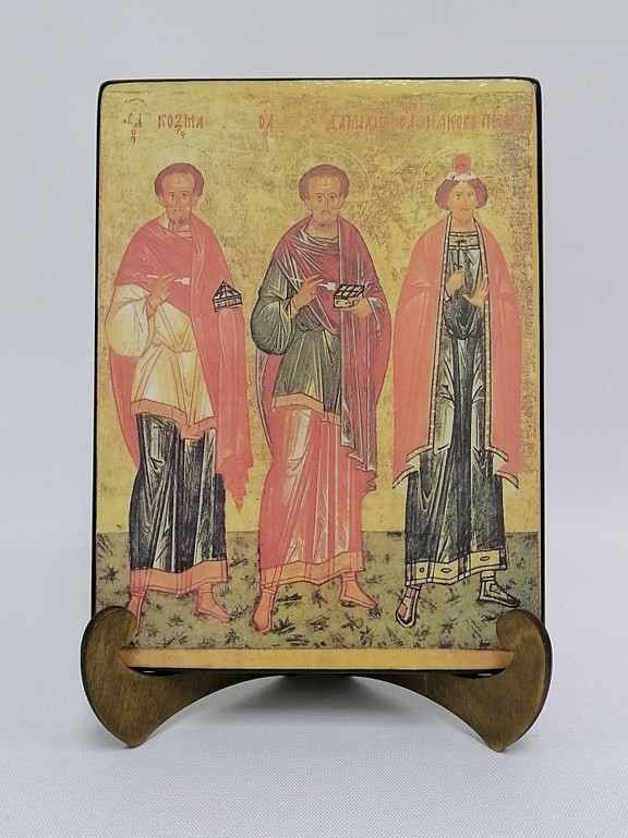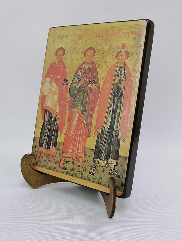 Икона на дереве "Святые Косьма, Дамиан, Иаков Персянин, 15x20x1,8 см, арт А6814" станет прекрасным подарком для верующего человека, а также займет особое место в любом доме, храме или церкви.