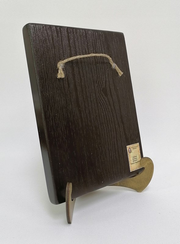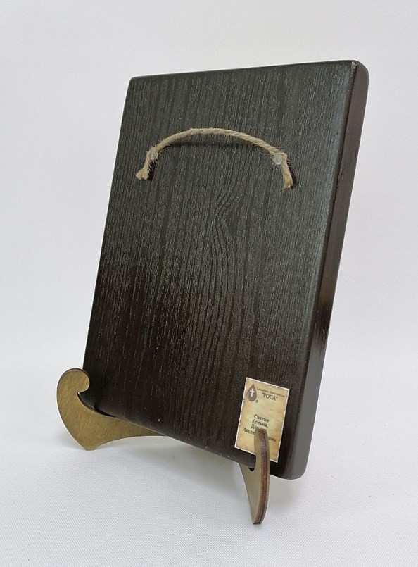 Икона на дереве покрыта несколькими слоями экологически чистого лака, который не выделяет вредных веществ и обеспечивает высокую устойчивость к выцветанию, воздействию ультрафиолета и влаги. Тыльная поверхность доски покрыта темной краской и 3 слоями защитного лака, что предотвращает выгибание иконы.