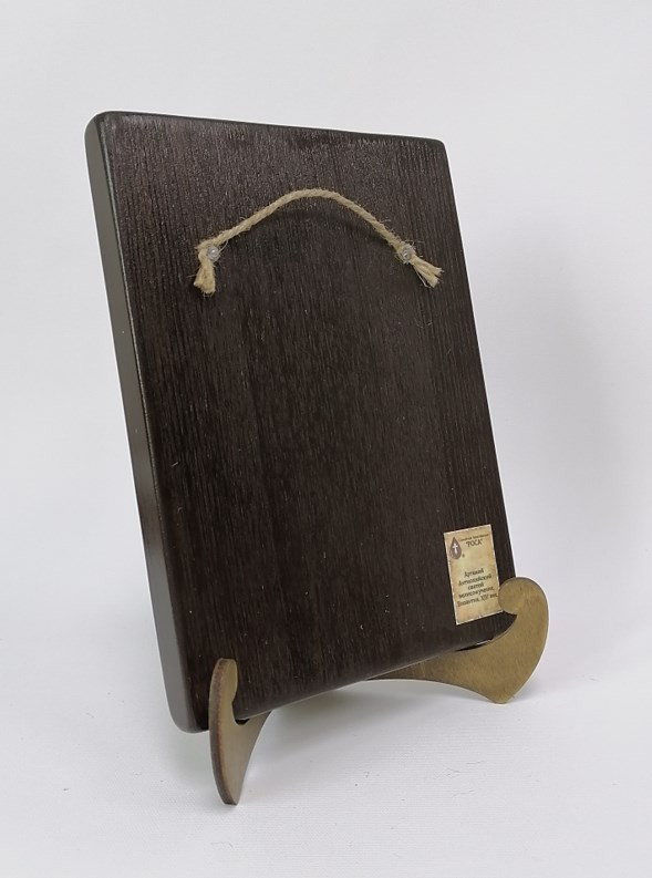 Икона на дереве покрыта несколькими слоями экологически чистого лака, который не выделяет вредных веществ и обеспечивает высокую устойчивость к выцветанию, воздействию ультрафиолета и влаги. Тыльная поверхность доски покрыта темной краской и 3 слоями защитного лака, что предотвращает выгибание иконы.