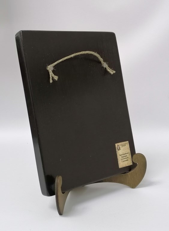 Икона на дереве покрыта несколькими слоями экологически чистого лака, который не выделяет вредных веществ и обеспечивает высокую устойчивость к выцветанию, воздействию ультрафиолета и влаги. Тыльная поверхность доски покрыта темной краской и 3 слоями защитного лака, что предотвращает выгибание иконы.