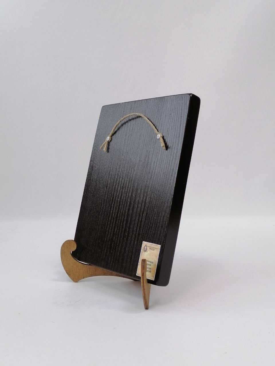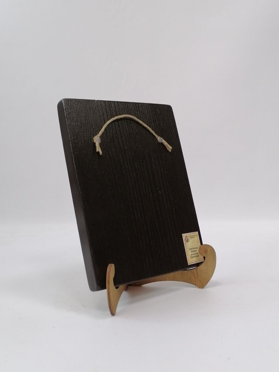 Икона на дереве покрыта несколькими слоями экологически чистого лака, который не выделяет вредных веществ и обеспечивает высокую устойчивость к выцветанию, воздействию ультрафиолета и влаги. Тыльная поверхность доски покрыта темной краской и 3 слоями защитного лака, что предотвращает выгибание иконы.