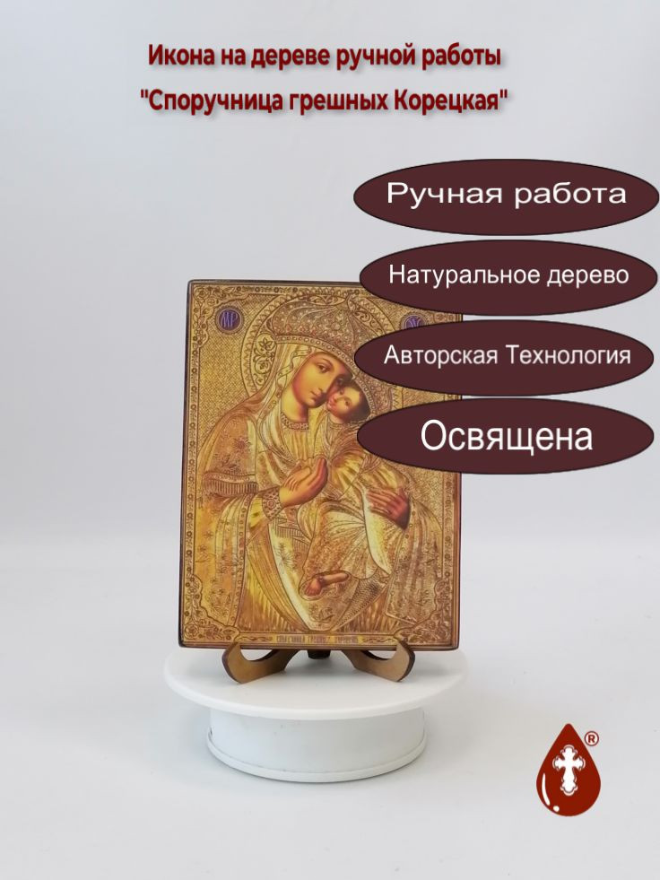 Икона на дереве "Споручница грешных Корецкая, 12x16x1,8 см, арт Ид3676-2" станет прекрасным подарком для верующего человека, а также займет особое место в любом доме, храме или церкви.