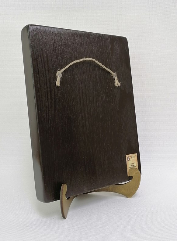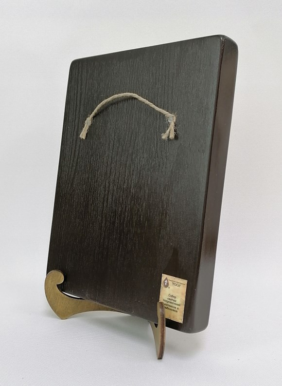 Икона на дереве покрыта несколькими слоями экологически чистого лака, который не выделяет вредных веществ и обеспечивает высокую устойчивость к выцветанию, воздействию ультрафиолета и влаги. Тыльная поверхность доски покрыта темной краской и 3 слоями защитного лака, что предотвращает выгибание иконы.