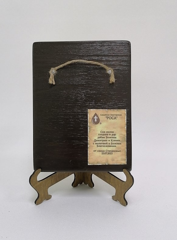 Икона на дереве покрыта несколькими слоями экологически чистого лака, который не выделяет вредных веществ и обеспечивает высокую устойчивость к выцветанию, воздействию ультрафиолета и влаги. Тыльная поверхность доски покрыта темной краской и 3 слоями защитного лака, что предотвращает выгибание иконы.