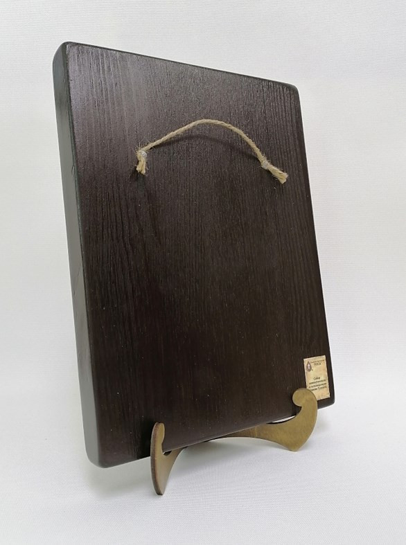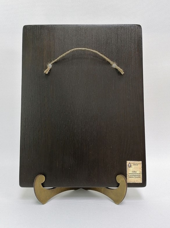 Икона на дереве покрыта несколькими слоями экологически чистого лака, который не выделяет вредных веществ и обеспечивает высокую устойчивость к выцветанию, воздействию ультрафиолета и влаги. Тыльная поверхность доски покрыта темной краской и 3 слоями защитного лака, что предотвращает выгибание иконы.