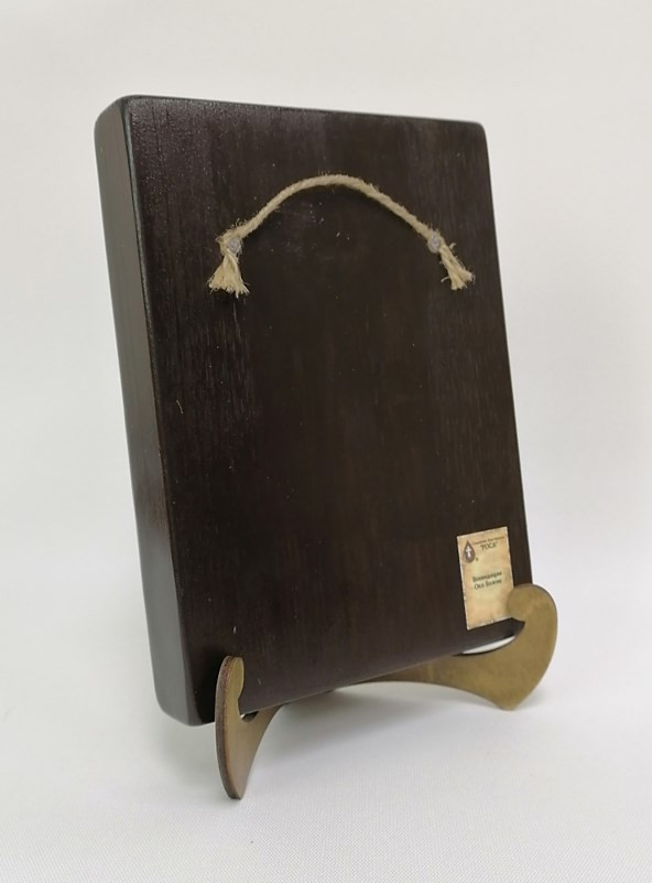 Икона на дереве покрыта несколькими слоями экологически чистого лака, который не выделяет вредных веществ и обеспечивает высокую устойчивость к выцветанию, воздействию ультрафиолета и влаги. Тыльная поверхность доски покрыта темной краской и 3 слоями защитного лака, что предотвращает выгибание иконы.