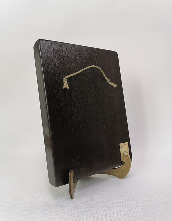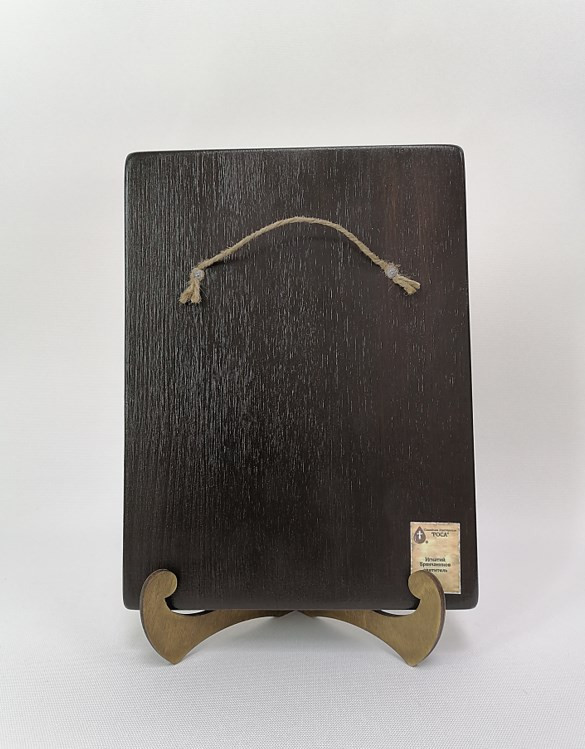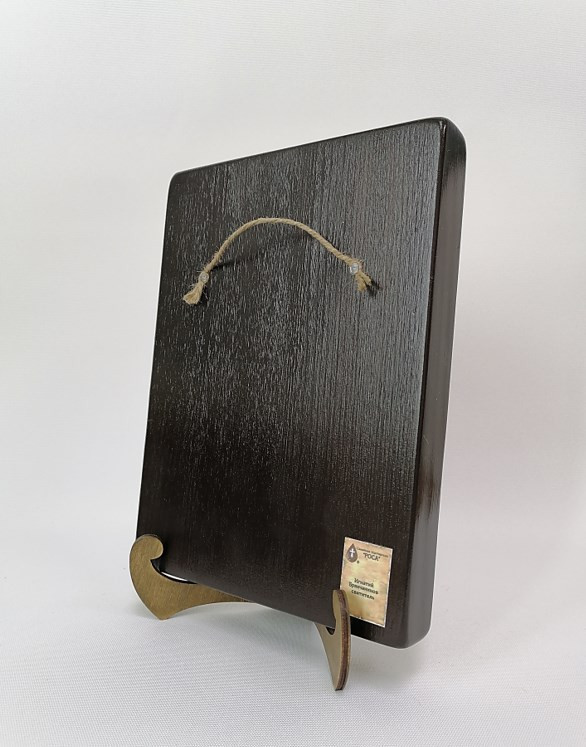 Икона на дереве покрыта несколькими слоями экологически чистого лака, который не выделяет вредных веществ и обеспечивает высокую устойчивость к выцветанию, воздействию ультрафиолета и влаги. Тыльная поверхность доски покрыта темной краской и 3 слоями защитного лака, что предотвращает выгибание иконы.