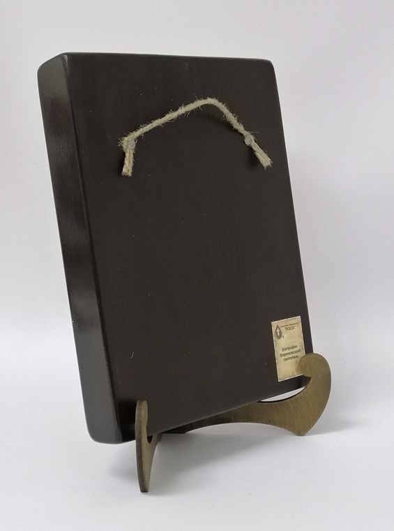 Икона на дереве покрыта несколькими слоями экологически чистого лака, который не выделяет вредных веществ и обеспечивает высокую устойчивость к выцветанию, воздействию ультрафиолета и влаги. Тыльная поверхность доски покрыта темной краской и 3 слоями защитного лака, что предотвращает выгибание иконы.