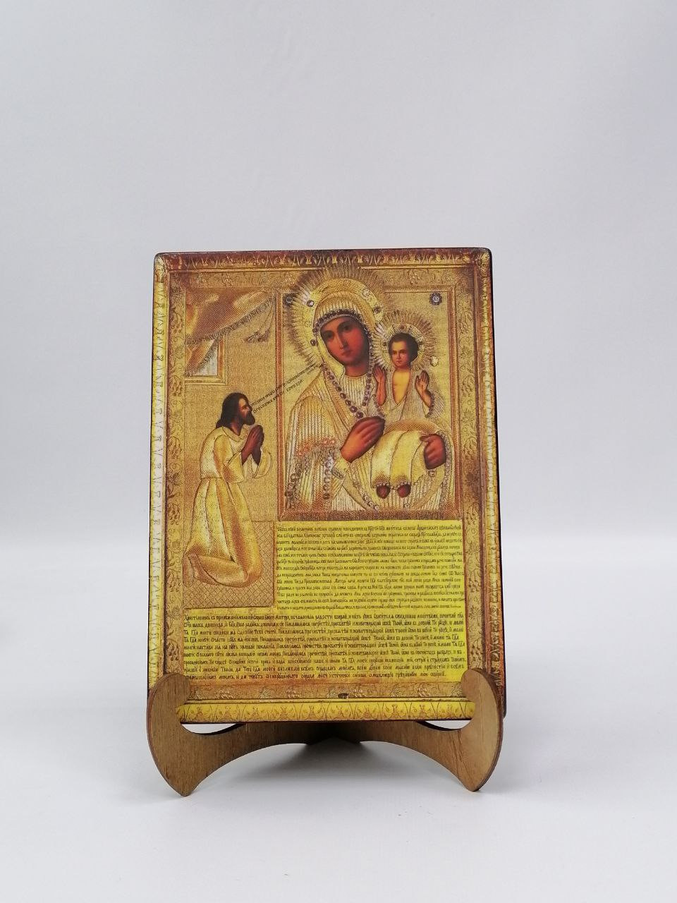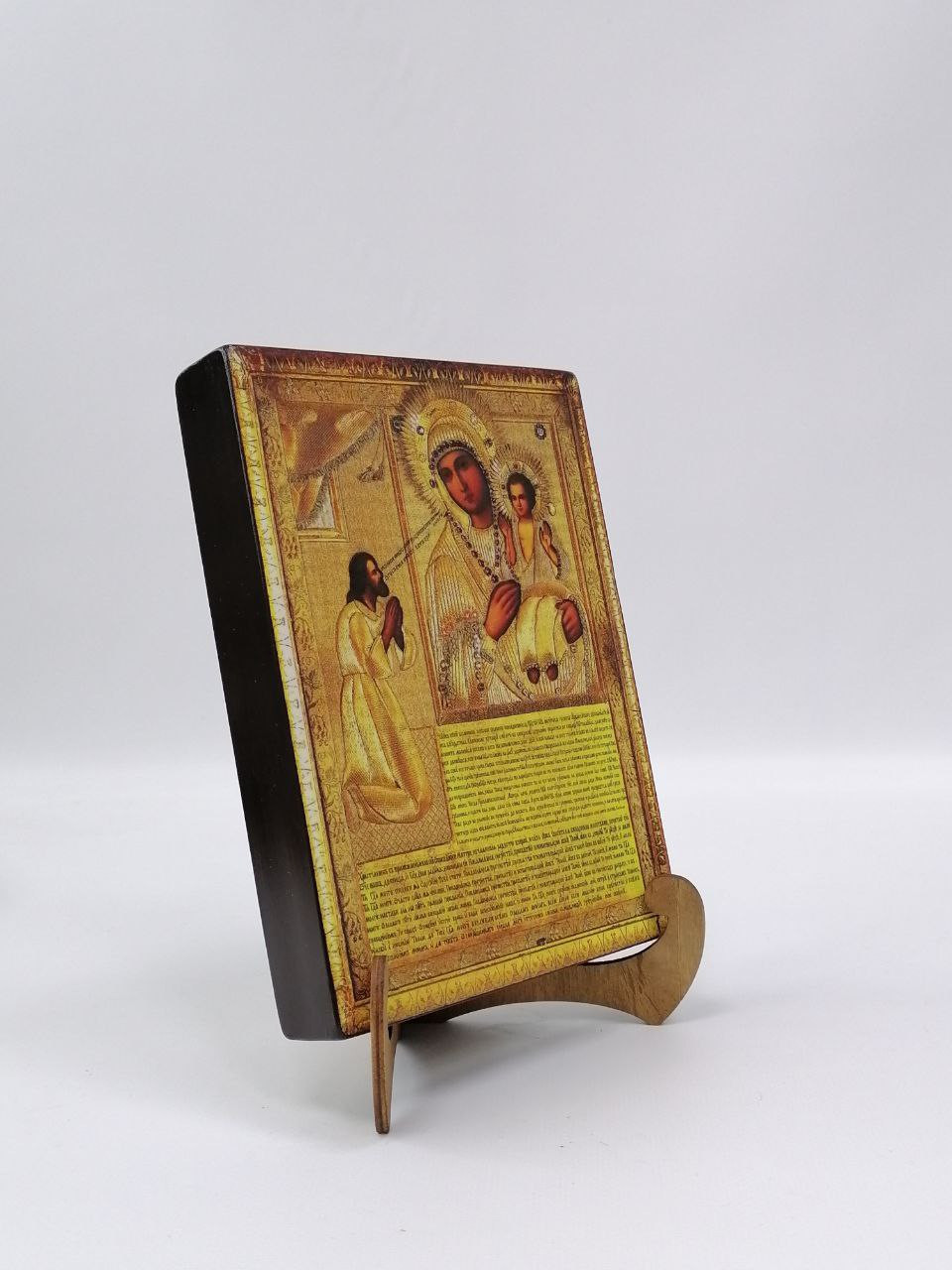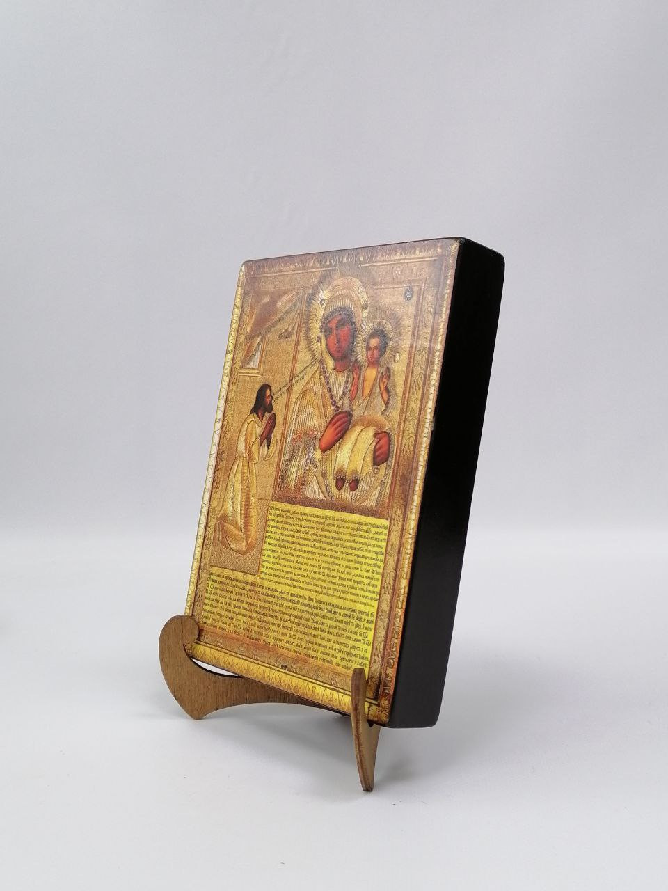 Икона на дереве покрыта несколькими слоями экологически чистого лака, который не выделяет вредных веществ и обеспечивает высокую устойчивость к выцветанию, воздействию ультрафиолета и влаги. Тыльная поверхность доски покрыта темной краской и 3 слоями защитного лака, что предотвращает выгибание иконы.