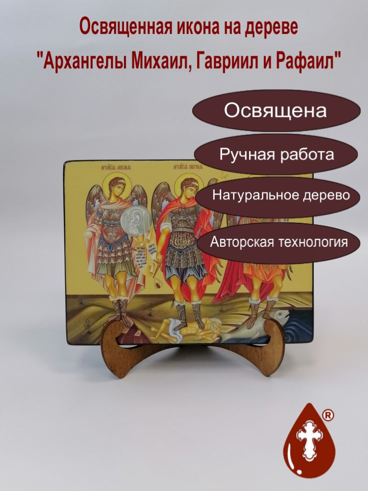 Икона на дереве "Архангелы Михаил, Гавриил и Рафаил, 15x20x3 см, арт Ид5061-2" станет прекрасным подарком для верующего человека, а также займет особое место в любом доме, храме или церкви.